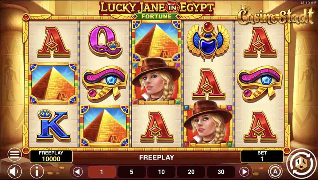 The slot sticks closely to the well-worn Egyptian theme, complete with pyramid backdrops and golden tones. Symbols include the classic A, K, and Q cards on the low end, while scarab beetles and the Eye of Horus serve as mid-tier payouts. The Pyramid and Lucky Jane are the premium symbols, offering up to 500x the stake for a five-of-a-kind combination. While the art is polished, it’s nothing that hasn’t been seen in countless other titles with a similar setting.