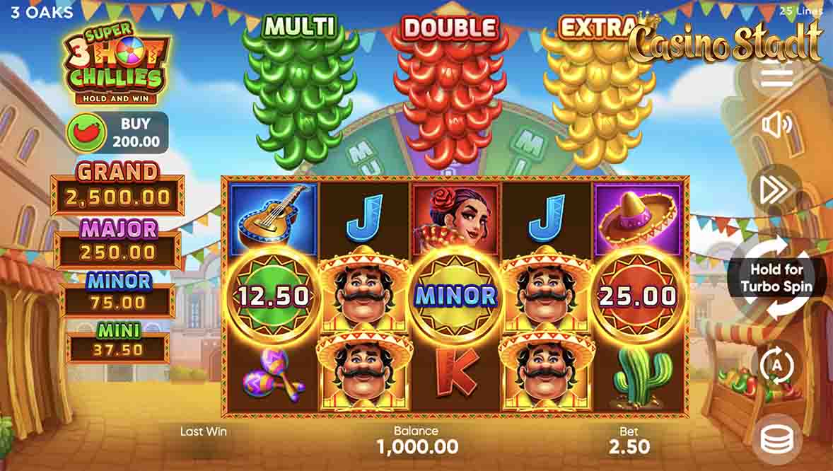 Set across a 5×3 grid with 25 paylines, the game is packed with thematic symbols ranging from cacti and guitars to sombreros and tequila bottles. Wilds — represented by smiling Mexican men — appear on reels two through five and replace all symbols except for the chilli bonus icons.