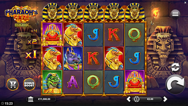 Pharaoh’s Gaze DoubleMax comes with a bundle of exciting features. The game has Dropdown and DoubleMax mechanics where the old icons are replaced by new ones and the increasing multiplier doubles with every win, respectively.