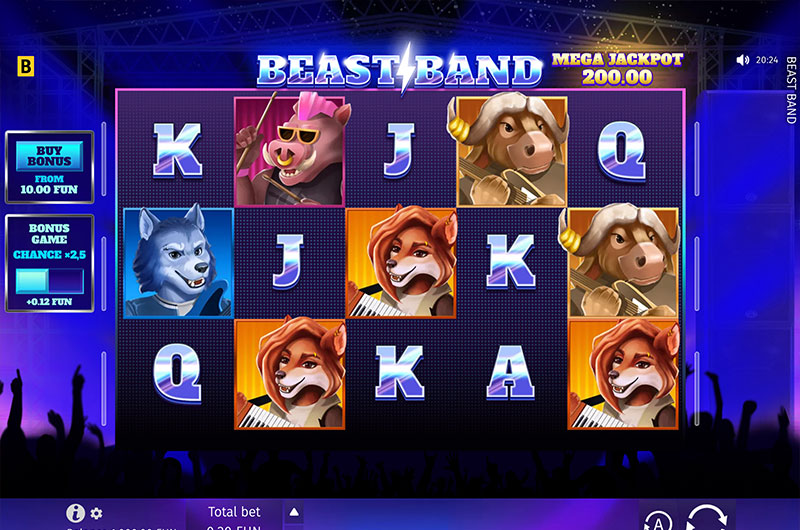 Beast Band was released by BGAMING in July 2023. The action in this whimsical music-themed fest occurs on a 5×3 grid with 25 paylines. The stakes in this mid-high volatility title fall in a modest range of $0.2 to $12. The max cash jackpot and the RTP peak at $240 and 96.83%, respectively.