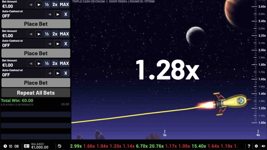 Triple Cash or Crash features three astronauts who have to be ejected before the rocket explodes mid-flight. Players can choose to place their bets on all three astronauts or any one of them. Moreover, they need to be alert as all winnings are lost if they fail to save them.