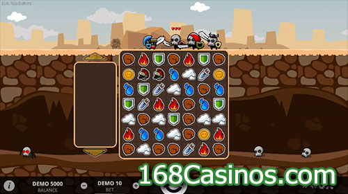 Epic Gladiators follows “Match 3” logics that sees objects appearing from the top and falling down the 7 rows of symbols unless 3 or more similar objects match and burst out in order to clear the space that new objects will fill.