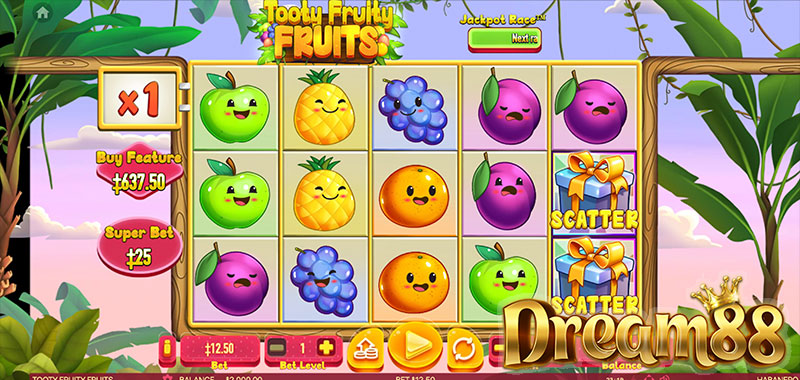 The Tooty Fruity feature generates a rainbow that fills the reels with a random icon, increasing the chances of winning big. The Free Spins round activates with 3 Scatters and awards 3 spins with an increasing multiplier.