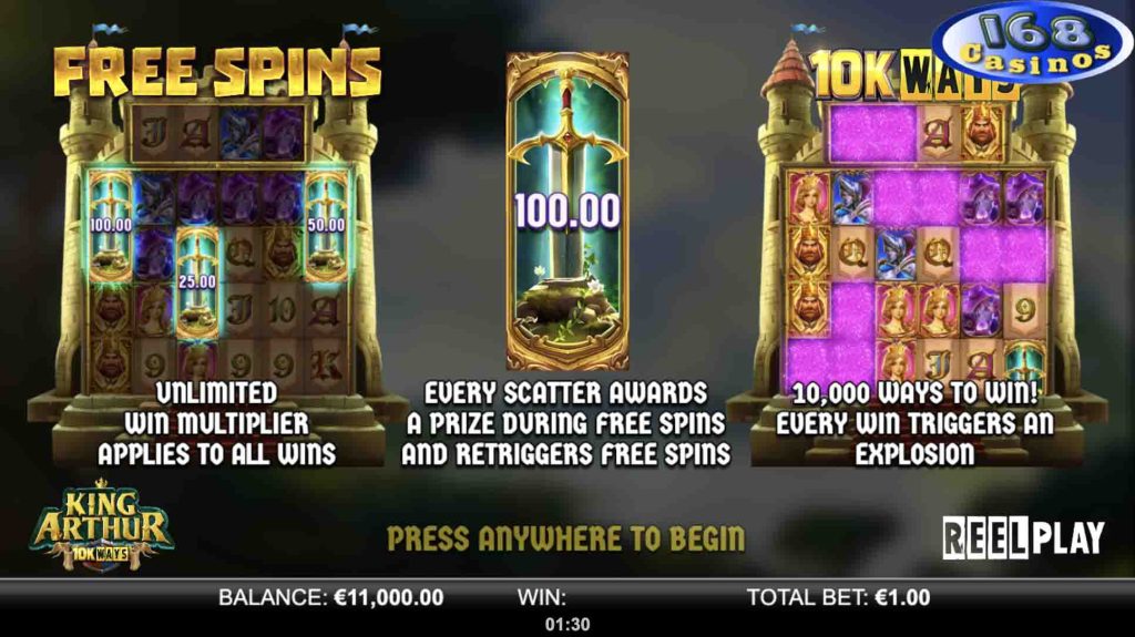 “King Arthur 10K WAYS” transports players to the fabled castle of Camelot. The game’s symbols include knights, royal rulers, wizards, and the golden chalice as the wild symbol. The 10K WAYS mechanic by ReelPlay ensures that winning combinations are removed from the reels, allowing new symbols to tumble into place. This cascading wins feature increases the potential for big wins, as each new win triggers another opportunity for rewards.