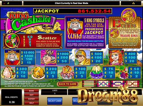 King Cashalot Slot เป็นเกมสล็อตแบบสะสมรางวัลแจ็คพอตต่อเนื่อง มีทั้งหมด 5 รีล และ 9 เพย์ไลน์ โดยผู้เล่นจะสามารถใช้เหรียญ coin ได้สูงสุดที่ 9 เหรียญต่อหนึ่งสปิน แต่ละ coin มีค่า 45 เซนต์ ถ้าเกิดว่าใครคิดว่าธีมแนวอัศวิน พระราชา หรือสาวงามผู้สูงศักดิ์ อะไรทำนองนี้ดูน่าสนใจ ก็น่าจะชอบเกม King Cashalot Slot นะครับ แน่นอนว่าฟีเจอร์ที่เด่นที่สุดของเกมก็คือ แจ็คพอตที่สะสมอย่างต่อเนื่อง ซึ่งมันสามารถสะสมไปได้จนเกินล้านเลยทีเดียว