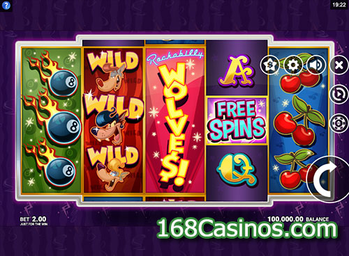 Players will find A, K, Q and J royals on the reels as well as 3 fully stacked higher-value symbols that are represented by cherries, 8-balls and the Rockabilly Wolves logo. The latter is the most lucrative and gives players 20 times their stake for 5 appearing across a full pay line while a fully stacked Wild symbol pays the same as the logo.