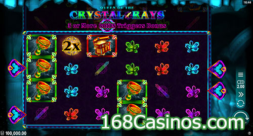 The Queen unleashes her mystical powers randomly on any spin during the Crystal Ray feature while landing three or more Scatter symbols anywhere on the reels activates the Queen of the Crystal Rays Bonus.