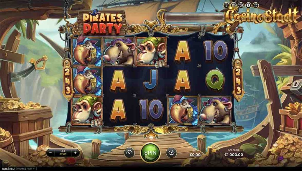 “Pirates Party” has a vibrant theme combining friendly animals and wild pirates in a lively setting. Players find themselves on a wooden boat, surrounded by water, engaging with cartoonish characters that bring the game to life. This blend of animals and pirates creates a whimsical and adventurous atmosphere, appealing to a wide range of players.