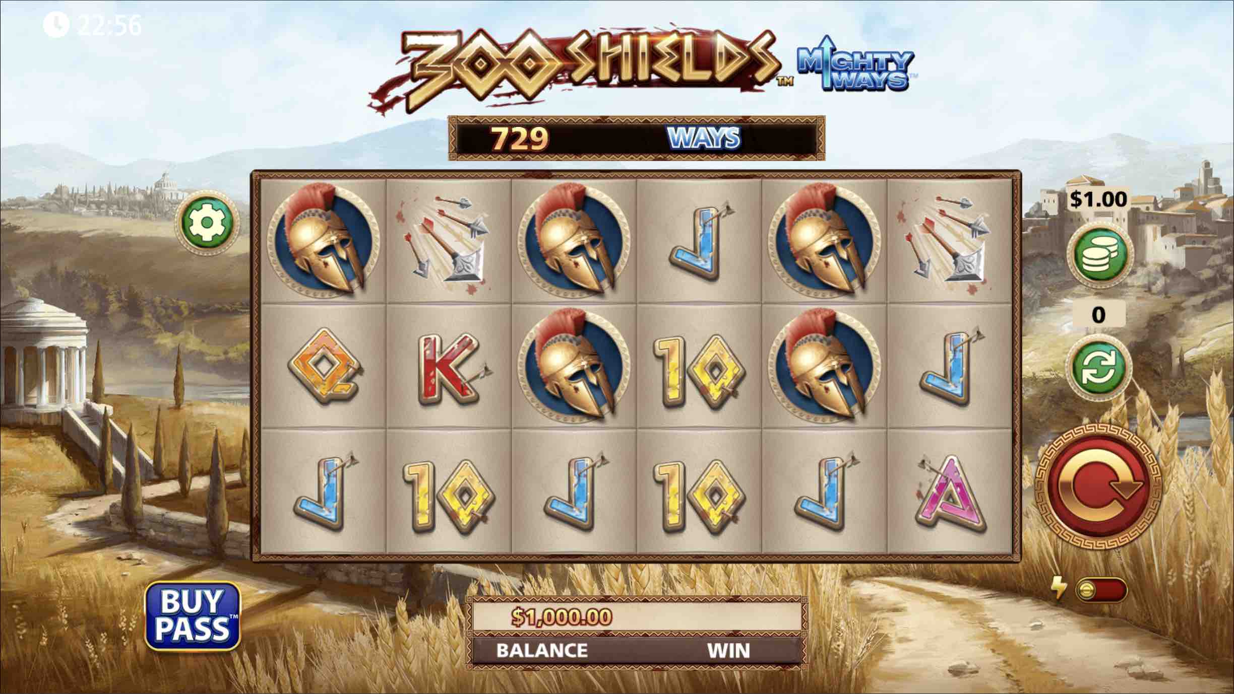 Landing 6 Scatters triggers the Super Free Spins, which yields 5 free rounds and a Warrior Wild with a 300x multiplier. Additional Scatters award 5 gratis spins. The Buy Pass option takes players directly to the bonus round.