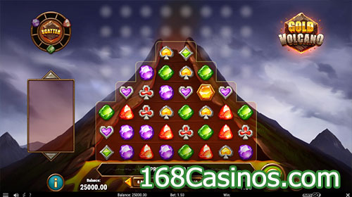 ‘Gold Volcano’ takes place with 8 reels and uses a Cluster Pay engine with 3, 4, 5, 6, 6, 5, 4 and 3 symbols on each respective reel in the shape of a volcano. A Cluster Win is awarded for 4 or more connected symbols, either vertically or horizontally with only the highest value cluster paid.