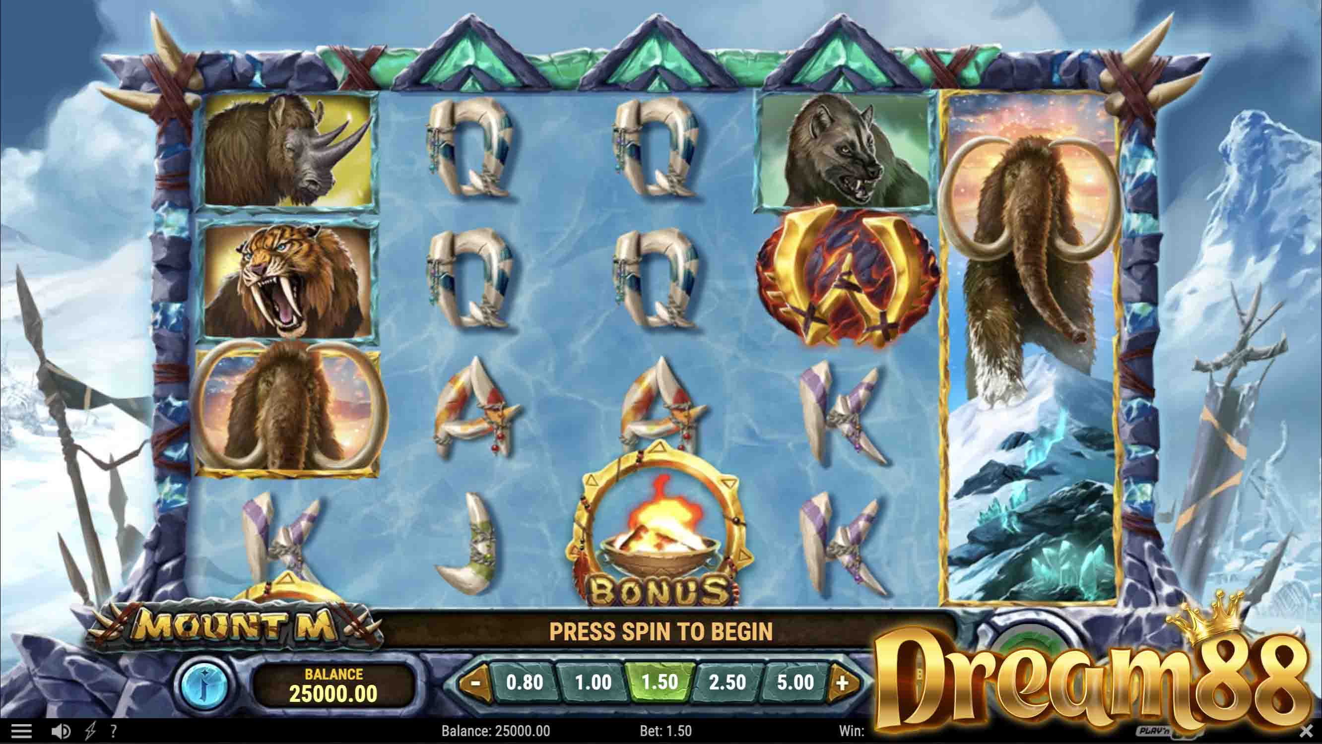 Mount M has two bonus features. The Shatter Re-Spins option activates when the Wild appears on the middle reels. The reels host 4 extra rows on top where any animal icon upgrades to the mammoth symbol. The winning ways increase to 8,192 from 1,024.