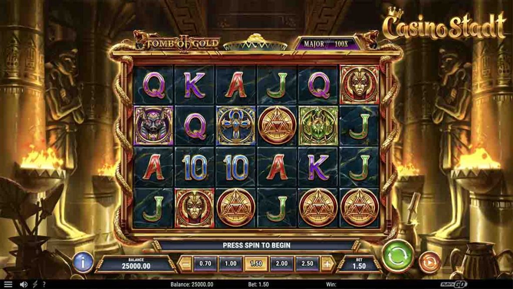 Tomb of Gold II runs on a 6×4 reel setup and offers 4,096 ways to win. Symbols land across adjacent reels from left to right, providing plenty of chances to strike gold. The game balances risk and reward with medium-high volatility and a player-friendly RTP of 96.2%. Stakes range from a casual $0.10 to a high-roller’s $100 per spin.
