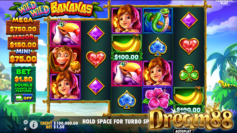 Pragmatic Play‘s wildlife-themed release, Wild Wild Bananas, invites players to win a $400 max cash jackpot! This slot provides you with great gameplay, a fun theme and top notch graphics.