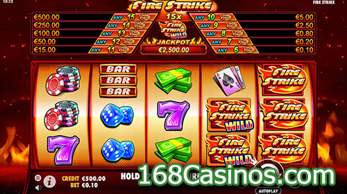 The Fire Strike Bonus feature is triggered if 6 or more Fire Strike symbols appear anywhere on the reels. A cash prize is awarded if 6 or more Fire Strike bonus symbols appear, with 6, 7, 8 9 or 10 of these symbols giving 1, 2, 8, 25 or 50 times their stake respectively. Players will receive 150, 500, 1,000, 2,500 or 5,000 times their stake if they get 11, 12, 13, 14 or 15 Fire Strike bonus symbols.