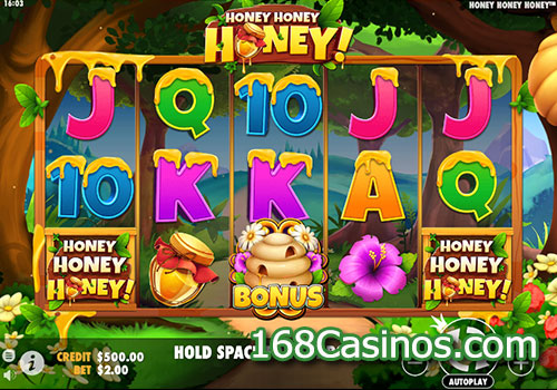 Colorful, cartoon style symbols on the reels of the game include honey covered A, K, Q, J and 10 Royals, honey pots, flowers and the ‘Honey Honey Honey’ logo with the latter rewarding players with 0.1, 2, 10 or 20 times their bet for landing 2, 3, 4 or 5 in combination.