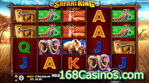 Symbols on the reels of the ‘Safari King’ slot game include A, K, Q, J, 10 and 9 Royals as well as animals such as Elephants, Cheetahs, Gazelles, Rhinos and Zebras. The most rewarding symbol is the Elephant that gives players 20 times their stake if 5 appear on a pay line.