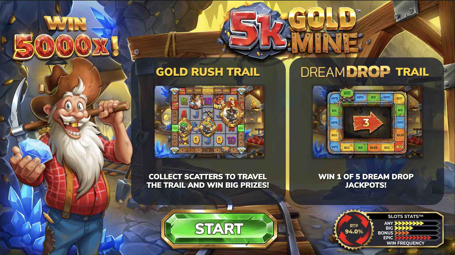In 5k Gold Mine Dream Drop, players will be thrilled to spin the reels to get to the 5,000 max cash jackpot. The only drawback here seems to be the 94% RTP which can be overlooked in favor of other positives.