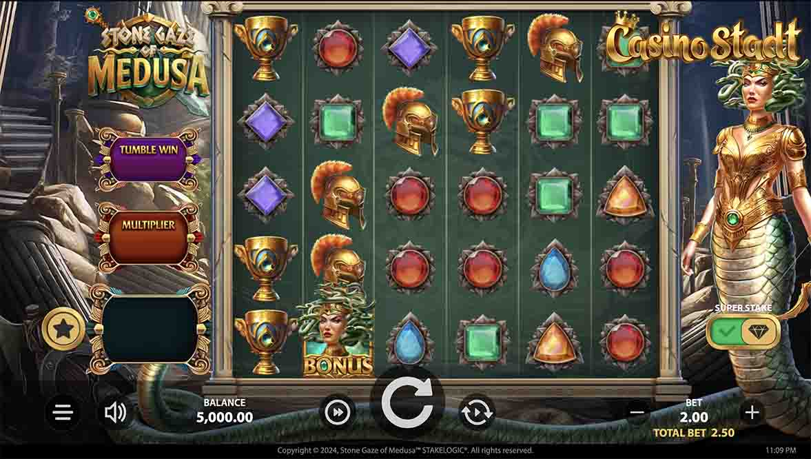 Stakelogic’s latest slot release, Stone Gaze of Medusa, brings players into the mythological world of Greek gorgons. This 6×5 reel slot offers cascading reels, free spins, multipliers, power symbols, and the innovative Spin to Win mechanic, which bridges traditional slot gaming with a live casino feel.