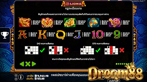 ตัวเกม 5 Lions Slot มีรูปแบบวิธีการชนะเกมมากถึง 243 แบบ และในระหว่างฟรีสปินจะกลายเป็น 576 แบบ เนื่องจากมีแถวบนสุดเพิ่มขึ้นมาบนรีลที่ 2 ถึงรีลที่ 4 ช่วยเพิ่มโอกาสในการชนะเกมมากขึ้นไปอีก พร้อมทั้งตัวคูณเงินรางวัลสูงสุด 40 เท่า
