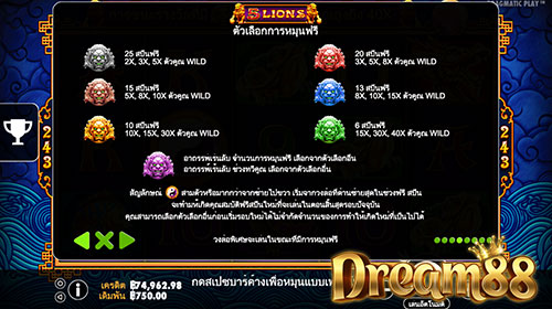 นอกจากจะได้ฟรีสปินแล้ว ตัว Scatter เองก็ให้เงินรางวัลเราตามจำนวนที่ได้ด้วยครับ ส่วนฟรีสปินเราจะสามารถเลือกได้ว่าจะเล่นแบบไหน มีให้เลือกตั้งแต่ฟรีสปิน 25 ครั้ง กับตัวคูณเงินรางวัล 2-5 เท่า ไปจนถึงฟรีสปิน 6 ครั้ง กับตัวคูณเงินรางวัล 40 เท่าครับ แต่ต้องไม่ลืมว่าตัวคูณเงินรางวัลจะมีผลก็ต่อเมื่อในคอมบิเนชั่นของเรามี สัญลักษณ์ Wild (สัญลักษณ์รูปสิงโต) เป็นส่วนประกอบเท่านั้นนะครับ
