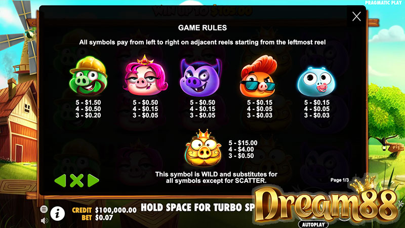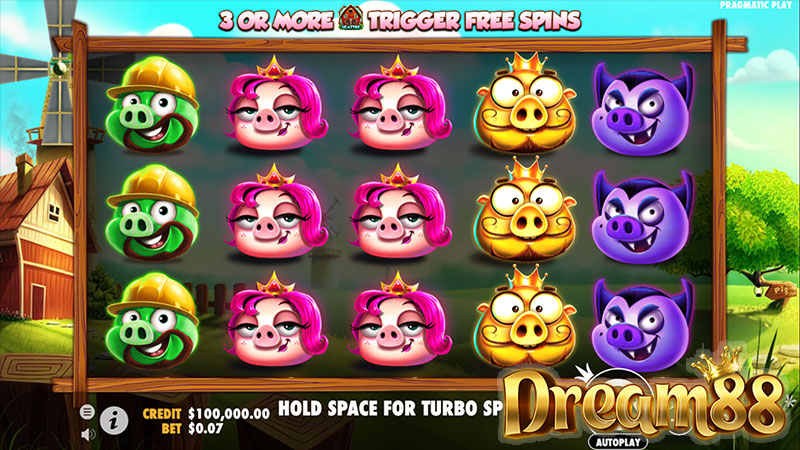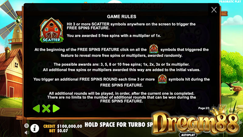 เอาล่ะเรามาพูดถึงฟีเจอร์ของเกมนี้กันบ้างดีกว่าครับ อย่างแรกเลยก็คือ Wild ที่เป็นสัญลักษณ์รูปหมูทอง ใช้แทนสัญลักษณ์ใดก็ได้ภายในเกม ถัดมาจะเป็น Scatter ที่ถูกแทนด้วยรูปโรงนา มีตัวหนังสือกำกับไว้ด้านล่างว่าเป็น Scatter โดยสัญลักษณ์นี้จะทำงานก็ต่อเมื่อเราได้รับครบ 3 อันหรือมากกว่านั้นที่ตำแหน่งไหนก็ได้ในวงล้อ เมื่อได้ครบแล้ว ฟรีสปินจะทำงานทันที