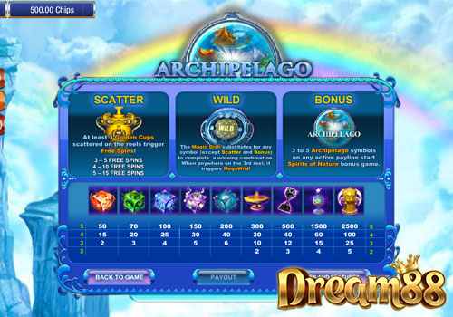 นอกจากนี้ โลโก้ของเกม Archipelago ยังเป็นสัญลักษณ์โบนัสที่จะเริ่มเกม Spirits of Nature ถ้าหากได้ตั้งแต่ 3 ครั้งขึ้นไปบนเพย์ไลน์ที่เล่นอยู่ โบนัสนี้จะทำให้เรารวยได้เลยครับถ้าเราพยายามขุดคุ้นหาสมบัติเรื่อยๆ มันจะมีโลกทั้งหมด 4 โลกให้เราเลือกหนึ่งในนั้น และรางวัลลับที่ซ่อนไว้อยู่ก็จะเผยตัวออกมา
