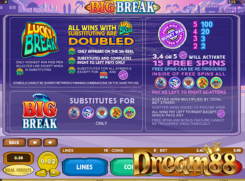 เกม Big Break เป็นเกม 5 รีลสล็อตผลิตจากบ้าน Microgaming ก็เหมือนชื่อเกมที่บอกให้เราพอเดาได้ เกมนี้ก็มีธีมแนววันหยุดที่มีเพย์ไลน์มานำเสนอเราด้วยกัน 15 เพย์ไลน์ และถ้าเราลองดูที่สกรีนแล้วจะเห็นได้ว่า ทำไมเกมนี้ถึงได้ชื่อ Big Break