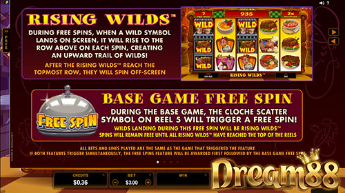 สังเกตสัญลักษณ์นี้ได้จากคำว่า Free Spin และนอกจากนี้เราก็ยังจะได้พบกับฟีเจอร์ Rising Wilds ซึ่งหมายถึงสัญลักษณ์ Wild จะพุ่งขึ้นไปในทิศทางด้านบนของแถว ทำให้เกิดเป็น Wild แถวยาว และจะเกิดในระหว่างฟรีสปินด้วย ถ้าเกิดเราได้สัญลักษณ์ Wild บนแถวที่ 2 หรือ 3 เราจะได้ฟรีสปินทั้งหมด 10 ครั้ง พร้อมด้วยเงินรางวัลคูณเข้าไปอีก 2 เท่า และ Wild ก็จะยังเลื่อนพุ่งไปด้านบนอีก ทำให้เรามีโอกาสได้ชนะเกมเพิ่มขึ้นตลอด