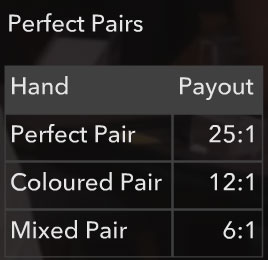 - ช่องด้านซ้าย Pair Plus หรือ เดิมพันไพ่คู่ ถ้าเราเล่นเดิมพันในส่วนนี้ เราได้ได้เงินต่อเมื่อไพ่ 2 ใบของเราเป็นคู่ครับ ซึ่งอัตราการจ่ายเงินก็ตามตารางด้านล่างครับ