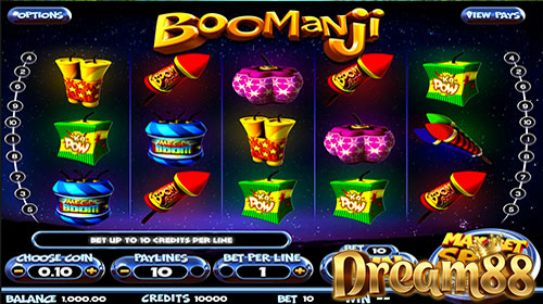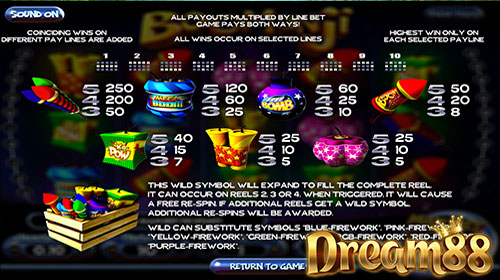 ก่อนจะเริ่มกดสปินกัน เราก็ต้องเลือกตัวเลือกบางอย่างก่อน อย่างเช่น อยากจะลงเงินเดิมพันที่เพย์ไลน์ไหน หรือจำนวนเหรียญ coin ต่อไลน์ และค่าเงินเหรียญ coin ที่ต้องการ ตรงนี้เราจะเห็นเครื่องหมาย + กับ – ที่เป็นตัวช่วยในการใส่ข้อมูลตัวเลือกต่างๆ และเนื่องจากเกม Boomanji Slot นี้ไม่มี Scatter หรือ Bonus ก็เลยต้องอาศัยรูปสัญลักษณ์ ลังไม้ที่บรรจุพลุเอาไว้ข้างใน ซึ่งตัวนี้เองครับที่ทำหน้าที่เป็น Wild ซึ่งก็จะช่วยให้เราชนะเกมได้ง่ายขึ้น ถึงแม้ว่าจะไม่มีโบนัสในเกมนี้ แต่ผู้เล่นใหม่ๆกลับรู้สึกว่ามันดีกว่า เพราะไม่ต้องมานั่งเจอกับด่านโบนัสยากๆซับซ้อนให้มันยุ่งยากเข้าไปอีก