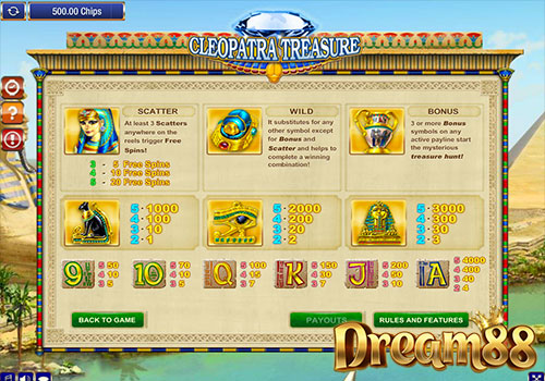 ฟีเจอร์และโบนัสในเกม Cleopatra Treasure Slot