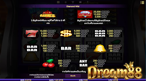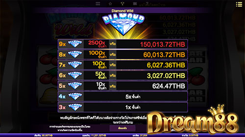 ถ้าเราสังเกตที่ด้านบนหน้าจอ จะเห็นได้ว่ามีจำนวนเงินรางวัลกำกับไว้อยู่ค่ะ แต่ละจำนวนขึ้นอยู่กับสัญลักษณ์ Diamond ที่เราได้ โดยจะคิดจากจำนวนสัญลักษณ์ที่ปรากฏขึ้นทั้งหน้าจอ ไม่นับเป็นแถว ๆ นะคะ พูดง่าย ๆ ก็คือ จะอยู่ตำแหน่งใดก็ได้บนหน้าจอ เพียงเท่านี้ก็มีสิทธิ์ได้รับแจ็กพ็อตสูงสุดถึง 2500x ของเงินเดิมพันแล้วค่ะ เช่น เดิมพัน 10 บาท แจ็กพ็อตสูงสุด คือ 25,000 บาท เป็นต้น