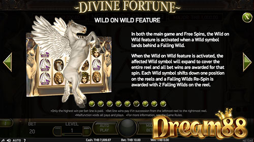 ฟีเจอร์ Wild on Wild คือ ฟีเจอร์ที่จะทำงานก็ต่อเมื่อมีสัญลักษณ์ Wild ปรากฏขึ้นด้านหลัง Falling Wild ถ้าฟีเจอร์นี้ทำงาน รีลทั้งรีลจะถูกคลุมด้วยสัญลักษณ์เพกาซัสแบบเต็มตัว จากนั้นก็จะค่อย ๆ เลื่อนลงไปตามฟีเจอร์ Falling Wild ค่ะ ได้สปินฟรีหลายครั้งอยู่ค่ะ