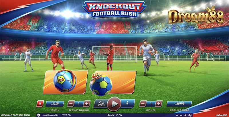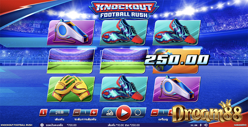 Knockout Football Rush เกมสล็อตธีมฟุตบอลจากค่าย Habanero ที่แฟนๆกีฬาฟุตบอลต้องไม่พลาด ฟีเจอร์ยิงจุดโทษ ที่ไม่เหมือนใคร กับสัญลักษณ์จ่ายรางวัลในเกมที่เกี่ยวข้องกับฟุตบอลทั้งหมด ไม่ว่าจะเป็น ลูกฟุตบอล สนามฟุตบอล รองเท้านักเตะ ถุงมือโกล์ นกหวีดกรรมการ กับซาวด์เอฟเฟกต์ที่เหมือนกำลังชมการถ่ายทอดกีฬาฟุตบอลแบบติดขอบสนาม