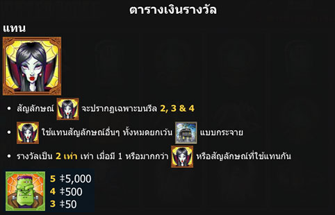 เกมนี้สัญลักษณ์ Wild มี 2 แบบ ได้แก่ แวมไพร์ และ แฟรงเกนสไตน์ ทั้งสองอย่างนี้สามารถแทนที่ได้ทุกสัญลักษณ์ในเกมยกเว้นสัญลักษณ์ Scatter ครับ