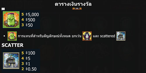 ในขณะที่ แฟรงเกนสไตน์ ปรากฏได้ทุกที่ และจะมีการจ่ายเงินรางวัลของตัวเองด้วย เมื่อได้ครบ 3 อันขึ้นไปบนเพย์ไลน์ เงินรางวัลเริ่มตั้งแต่ 4 ถึง 400 เท่าของเงินเดิมพันครับ