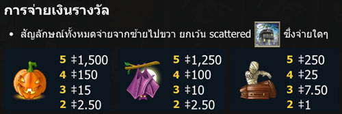สัญลักษณ์ต่าง ๆ เช่น เหล่าภูตผี ค้างคาว มัมมี่ที่ตื่นขึ้นมาจากโลง หลุมศพ และอื่นๆ อีกมากมาย ซึ่งทำออกมาได้เข้ากับธีมมากครับ ผู้เล่นคนไหนที่ชอบแนวภูตผี ปิศาจ เกมสล็อตออนไลน์เกมนี้น่าจะถูกอกถูกใจนะครับ ถ้าเป็นเทศกาลฮาโลวีนก็จะเข้ากันกับบรรยากาศมากขึ้นไปอีกครับ