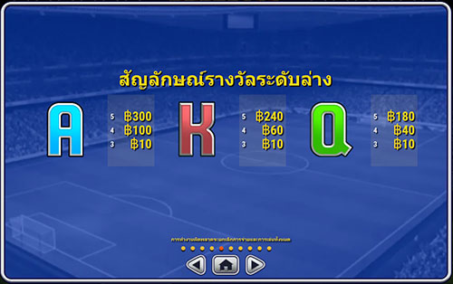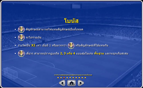 เนื่องจากเกมนี้มีฟีเจอร์เยอะ จึงต้องแบ่งเป็นหัวข้อหลัก ๆ กันก่อนนะคะ สังเกตที่สัญลักษณ์ Wild ของเกมนี้จะมี 2 แบบ คือ สัญลักษณ์ลูกฟุตบอล และ สัญลักษณ์ถ้วยรางวัล ซึ่งทั้งสองอย่างนี้สามารถใช้แทนสัญลักษณ์อื่น ๆ ในเกมได้ทั้งหมด เพียงแต่ทั้งสองสัญลักษณ์นี้มีหน้าที่การให้โบนัสที่แตกต่างกันค่ะ