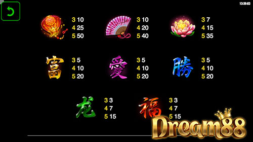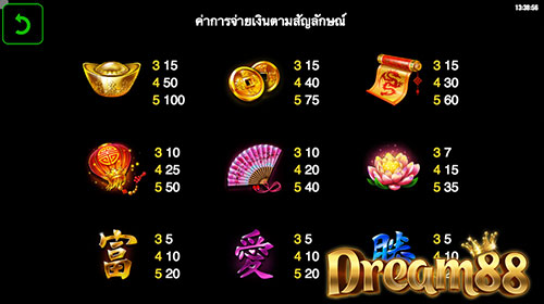 สัญลักษณ์อื่น ๆ ในเกมนี้ก็น่าสนใจไม่แพ้กันครับไม่ว่าจะเป็น หน้ากากงิ้ว โคมแดง ตัวอักษรจีน ตำลึงทอง และสัญลักษณ์อื่น ๆ ที่จะให้ค่าเงินรางวัลแตกต่างกันไป ให้ความรู้สึกถึงวัฒนธรรมจีนอย่างเต็มเปี่ยมกันเลยครับ