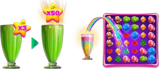 ทุกครั้งที่กดสปิน แก้วมิลค์เชคแบบสุ่มพร้อมตัวคูณจะปรากฏที่ด้านซ้ายของตารางสล็อต