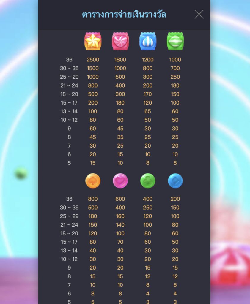 เมื่อกดปุ่มสปินที่เหมือนแป้นหมุนกาชาปอง ลูกกวาดหลากสีจำนวน 36 อันจะร่วงหล่นลงบนตารางสล็อตขนาด 6 x 6