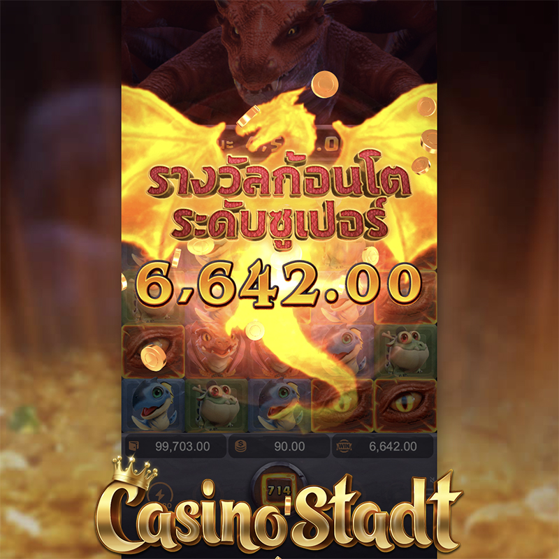 - ฟีเจอร์มังกรไฟ ー ฟีเจอร์จะทำงานเมื่อมิเตอร์สะสมสัญลักษณ์ได้อย่างน้อย 50 ตัว สัญลักษณ์จ่ายรางวัลแบบสุ่มจำนวน 1 ชนิดจะถูกเพิ่มในตารางแบบช่องเว้นช่อง (ยกเว้นตำแหน่งที่มีสัญลักษณ์ Wild)