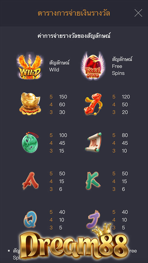 ถัดมาเราก็ต้องมาพูดถึงสัญลักษณ์ฟรีสปินกันค่ะ สังเกตได้จากคำว่า “FREE SPINS” ที่จะถูกเขียนกำกับไว้ตรงสัญลักษณ์อย่างชัดเจน การจะได้เล่นฟรีในเกม Phoenix Rises Slot เราจะต้องได้มากกว่า 5 อันที่ตำแหน่งไหนก็ได้บนหน้าจอ การหมุนฟรี 12 ครั้งจึงจะเริ่มต้นขึ้นค่ะ