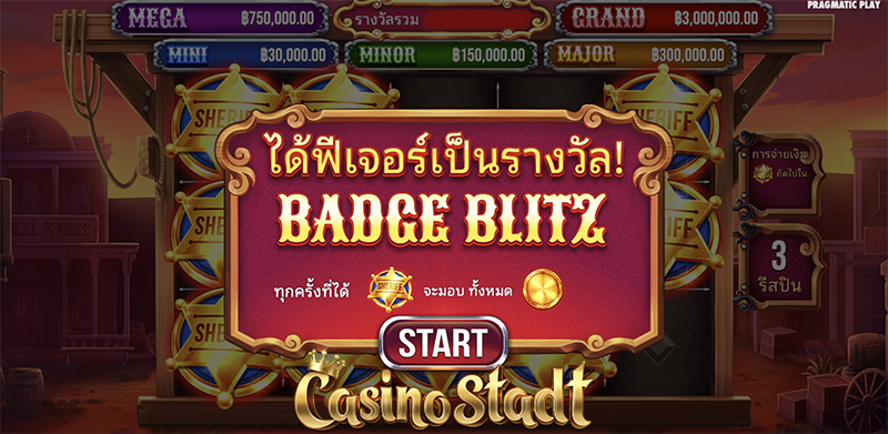 เหล่าคนนอกกฎหมายกำลังหลบหนีจากนายอำเภอ! สวมเสื้อเกราะและยิงปืนให้หมดแม็ก! ในเกมสล็อต Badge Blitz แบดจ์บลิทซ์ เกมสล็อตออนไลน์สไตล์ตะวันตกที่ออกแบบโดย Pragmatic Play ที่มีทั้งเกมฟรีสปินและรอบรีสปินโฮลด์แอนด์วิน สะสมสัญลักษณ์ตรานายอำเภอจะถูกแปลงเป็นสัญลักษณ์เงินเหรียญที่มีมูลค่าสูงสุดถึง 250 เท่า! และรอบฟรีสปินที่มีสัญลักษณ์ไวลด์ขยายเต็มรีล!