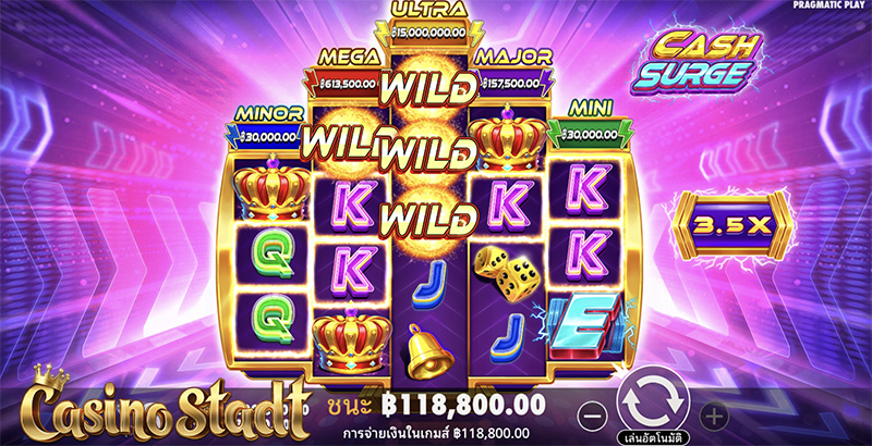 Cash Surge แคชเซิร์จ มีอัตราการจ่ายเงินคืนแก่ผู้เล่น หรือ ค่า RTP อยู่ที่ 96.52% และความผันผวนสูง ผู้โชคดีอาจได้รับรางวัลสูงสุด 5,000 เท่าของเงินเดิมพัน