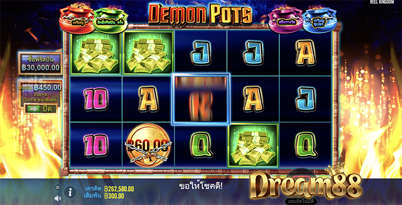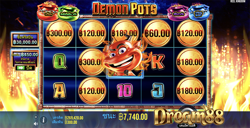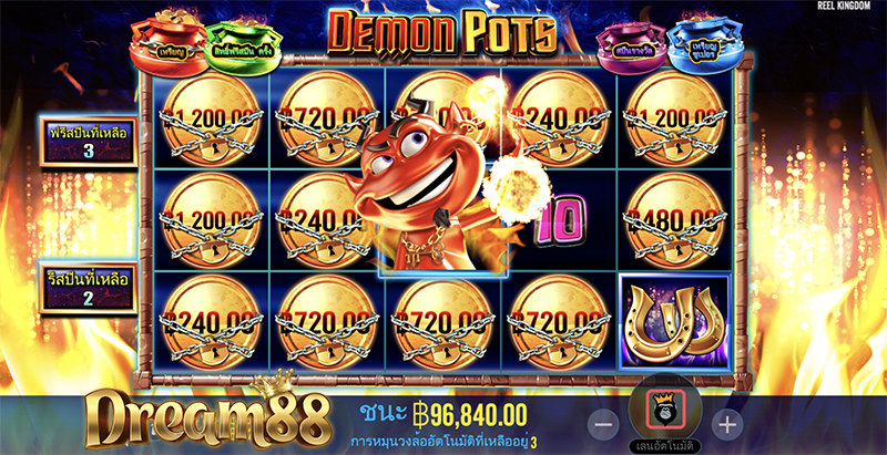สตูดิโอเกม Pragmatic Play จะพาคุณไปเล่นกับไฟ!! ในเกมสล็อตน้องใหม่มาแรง Demon Pots™ เดมอนพอทส์ เกมสล็อตที่มีตัวละครหลักเป็นพญามัจจุราช หรือที่เราๆมักเรียกกันว่า ท่านยม ที่จะคอยโยนลูกไฟลงในไหเพื่อเปิดใช้งานฟีเจอร์ที่แตกต่างกันถึง 4 แบบ!! เพียงได้สัญลักษณ์ Wildพร้อมกับสัญลักษณ์เหรียญก็สามารถเก็บรวบรวมมูลค่าเหรียญทั้งหมดบนตารางได้เลย!! นอกจากฟีเจอร์ที่หลากหลายแล้วยังสามารถซื้อฟรีสปินและซื้อโอกาสชนะฟีเจอร์เพิ่มขึ้นได้อีกด้วย รับรองว่าเกมนี้ไม่น่าเบื่ออย่างแน่นอน!!