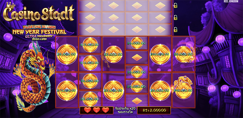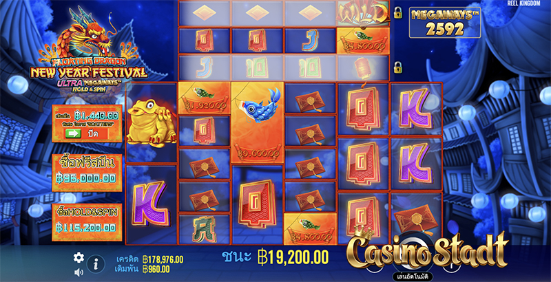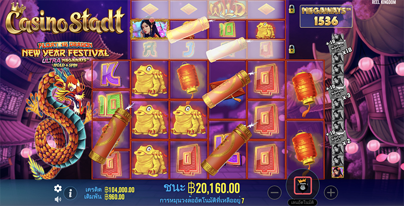 ในเกม Floating Dragon New Year Festival Ultra Megaways™ Hold & Spin โฟลทติ้งดราก้อนนิวเยียร์เฟสติวัลอัลตร้าเมกาเวย์โฮลด์แอนด์สปิน ผู้โชคดีสามารถชนะเดิมพันได้สูงสุดถึง 20,000 เท่า นั่นแปลว่า เพียงลงเดิมพันแค่ 10 บาท อาจจะได้กลับบ้านไปถึง 200,000 บาท ก็เป็นได้ สามารถเล่นเกมนี้ได้บนเว็บไซต์คาสิโนออนไลน์ชั้นนำของประเทศไทย ที่ Casino Stadt คัดสรรมาให้คุณ นอกจากยังมีเกมฮิตอื่นๆอีกเพียบให้คุณได้ร่วมสนุก ไม่ว่าจะเป็นเกมแจ็กพอต เกมยิงปลา เกมบิงโก คาสิโนสด ซิกโบ บาคาร่า รูเล็ต โป๊กเกอร์ แบล็คแจ็ค และอื่นๆอีกมากมาย!