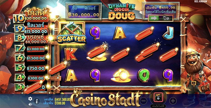 Dynamite Diggin Doug ไดนาไมต์ดิกกินดั๊ก มาในตารางสล็อตขนาด 5 × 3 และเพย์ไลน์ 10 เส้น