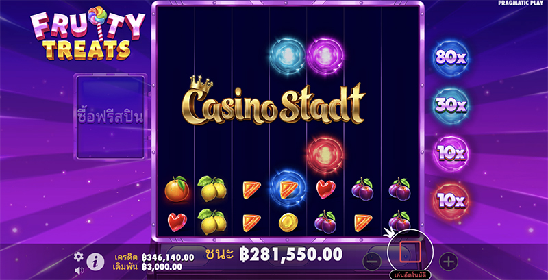 ค่าย Pragmatic Play ปล่อยเกมสล็อตธีมผลไม้น้องใหม่ Fruity Treats ฟรุตตี้ทรีตส์ มีการจ่ายรางวัลแบบคลัสเตอร์ เพียงได้สัญลักษณ์เดียวกันเชื่อมต่อกันอย่างน้อย 5 ตัวก็รับเงินรางวัลไปเลย! พลาดไม่ได้กับฟีเจอร์ตำแหน่งตัวคูณ สะสมตัวคูณผ่านตำแหน่งสีต่างๆถึงสี่สีผ่านฟีเจอร์ร่วงหล่น นอกจากนี้สำหรับผู้เล่นที่ชอบความรวดเร็วยังสามารถซื้อฟรีสปินหรือซื้อซูเปอร์ฟรีสปินกันได้ในราคาเพียง 100× และ 200× เท่าของเงินเดิมพัน!