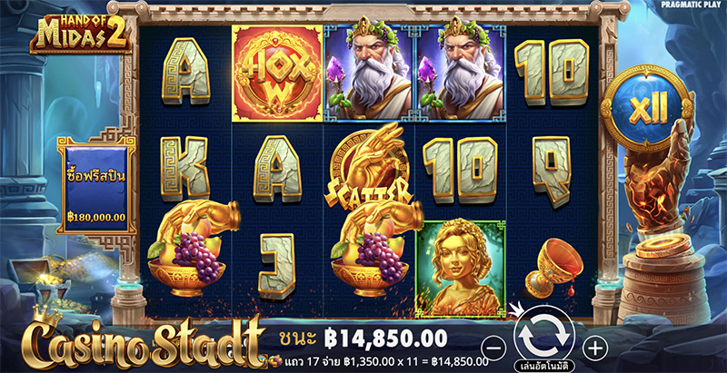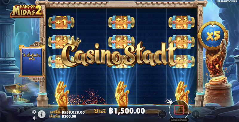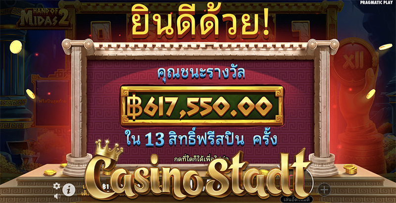 สัมผัสแห่งทองคำ จะทำให้คุณกลายเป็นเศรษฐีหรือไม่! ค่าย Pragmatic Play ปล่อยเกมสล็อตธีมกรีกโบราณเกมใหม่ล่าสุด Hand of Midas 2 แฮนด์ออฟไมดัส 2 และหากคุณชื่นชอบเกมสไตล์นี้ ที่เว็บไซต์ Casino Stadt เรามีรีวิวเกมสล็อต Midas Fortune โชคลาภแห่งไมดัส จากค่าย PG มากฝากด้วยเช่นกัน